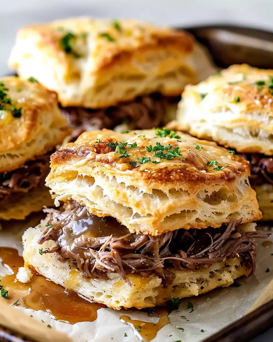 Once the biscuits are out of the oven and have cooled for a minute or two, it’s time to serve! Set them out with your warm dipping broth, and you’ll have a snack that’s both comforting and indulgent. Whether it's for game night, a cozy dinner, or just a casual gathering, these baked French dip biscuits will become an instant favorite.
