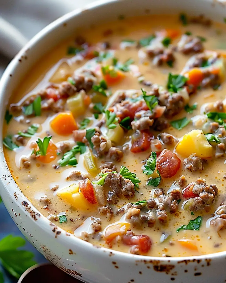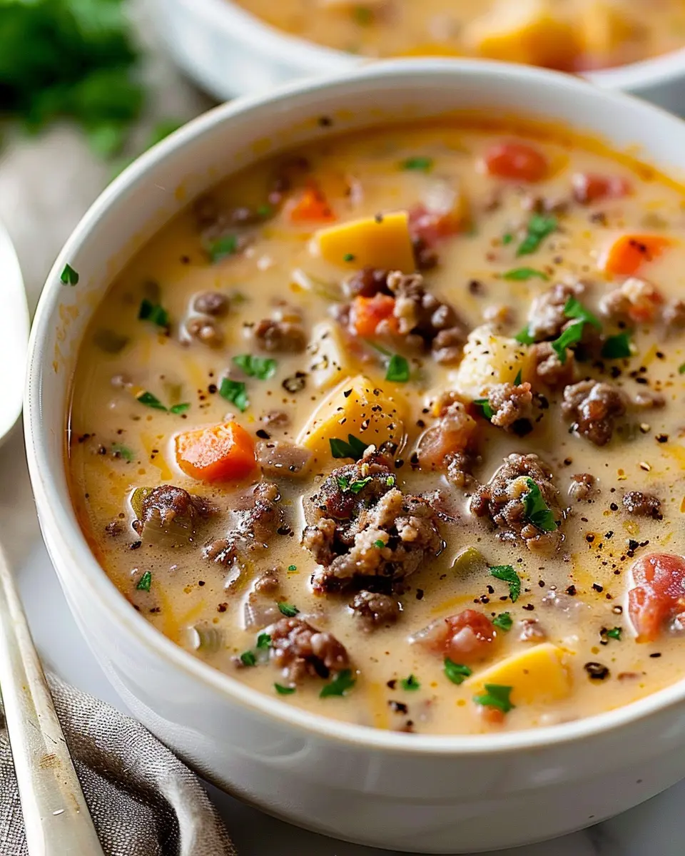 First and foremost, this recipe marries two beloved concepts: the cheeseburger and soup. The result is a creamy, cheesy concoction that envelops you in warmth with every spoonful. Imagine sinking into your couch with a big bowl of this hearty soup while watching your favorite show. It’s the kind of dish that wraps you in a cozy embrace, perfect for those long, chilly nights.