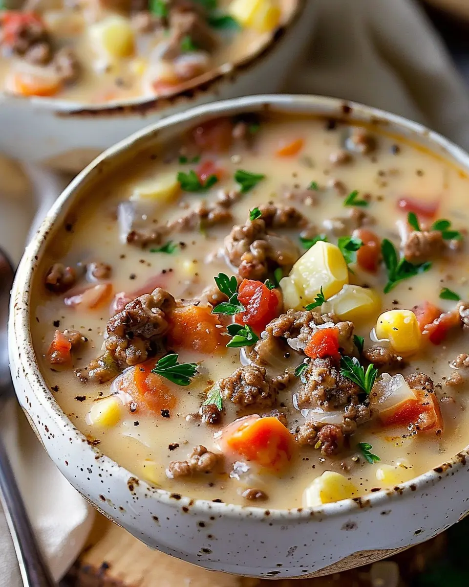 Serve hot, and maybe pair it with some crunchy bread for dipping. Imagine cozying up with a bowl of this delightful cheeseburger soup—it's the ultimate comfort food after a long day!