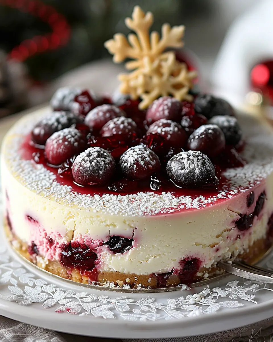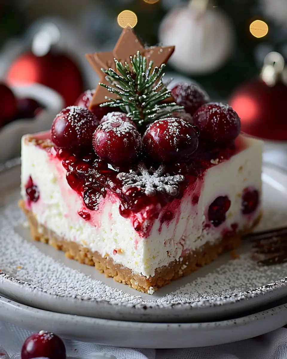 Indulge in the festive spirit with this delightful Christmas cheesecake topped with tart cranberry jam and a creamy white chocolate mousse. Perfect for holiday gatherings!