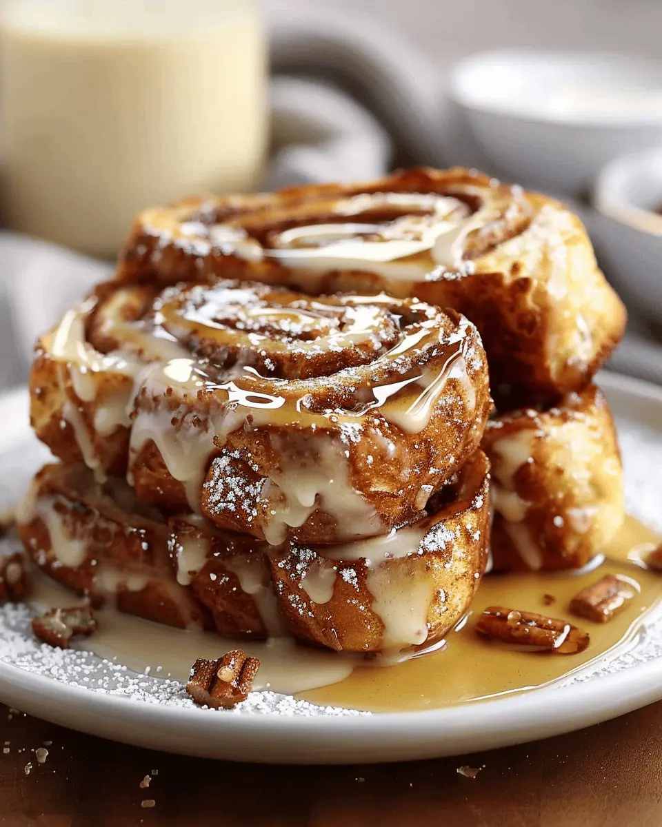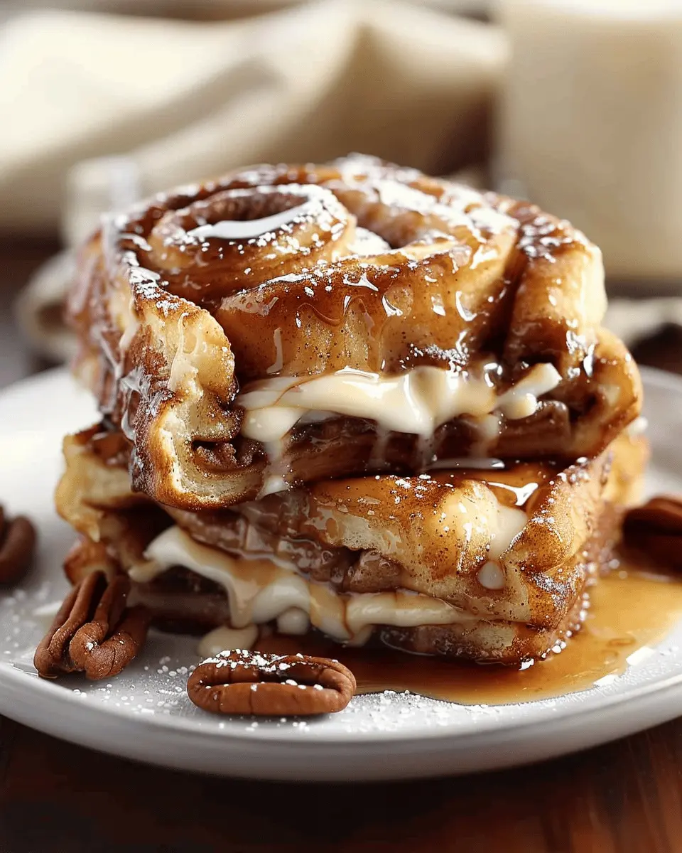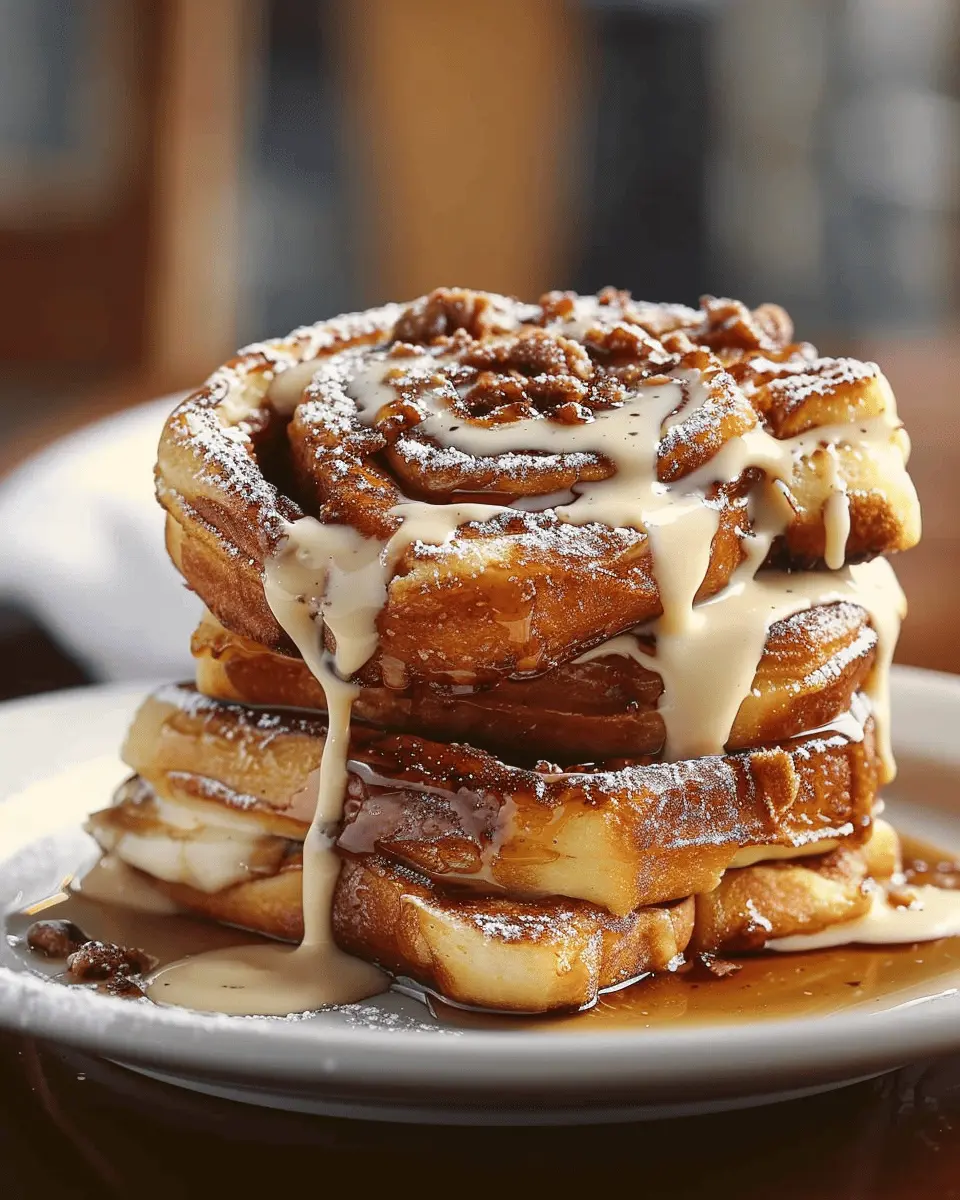 Finally, it’s time to serve your masterpiece! Plate your Cinnamon Roll French Toast and drizzle the creamy glaze generously over the top. Don’t forget to top it with a sprinkle of powdered sugar or fresh berries for that finishing touch.