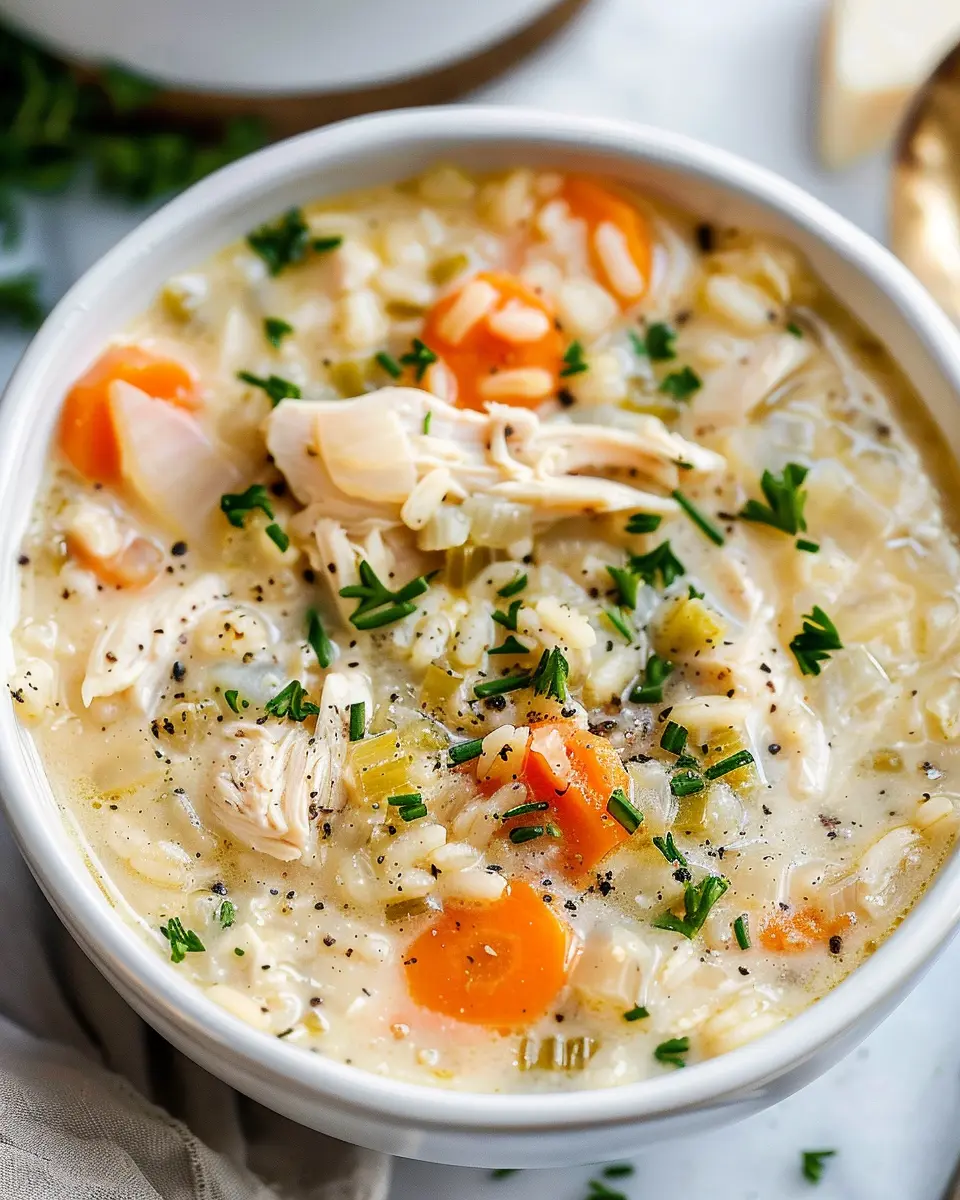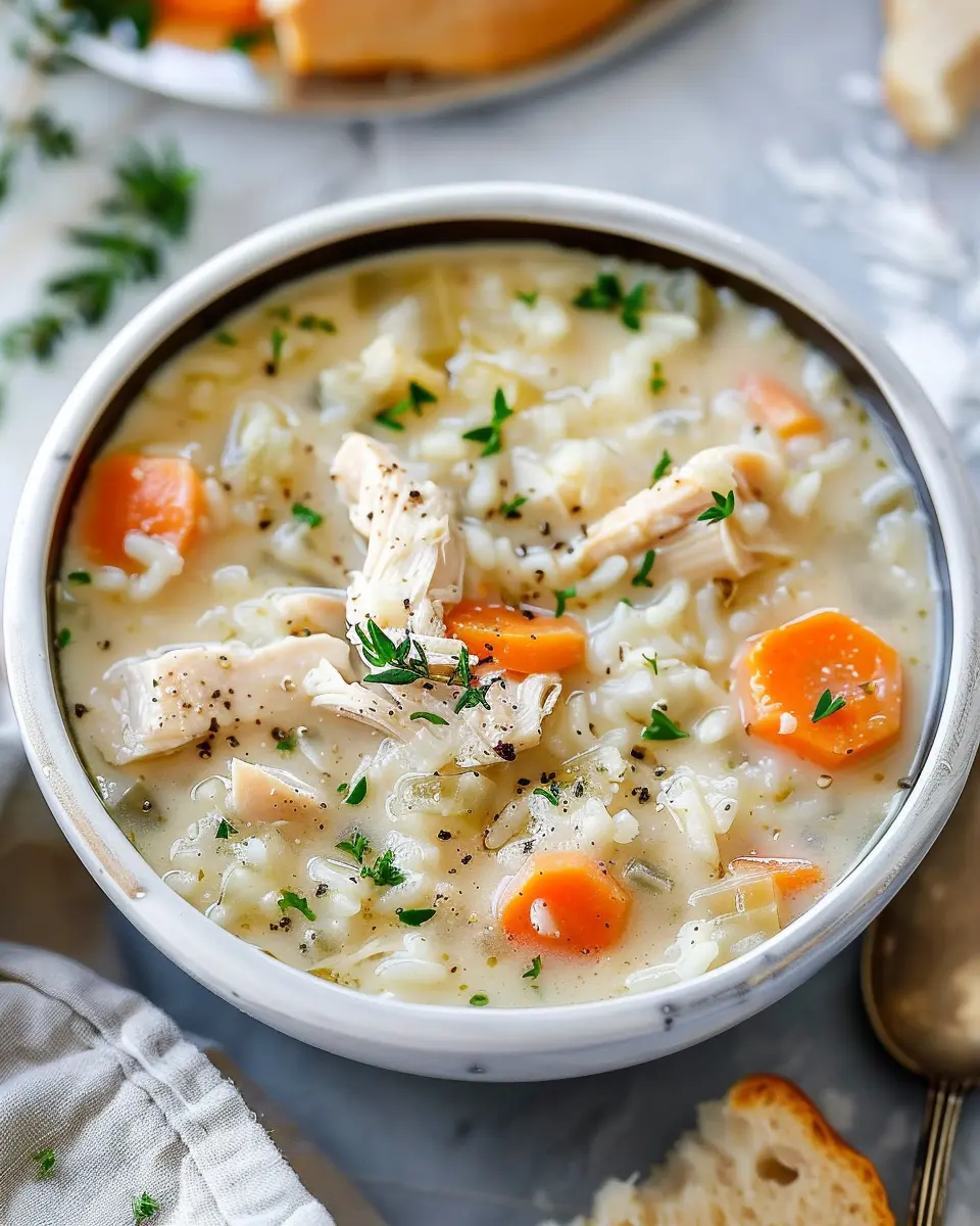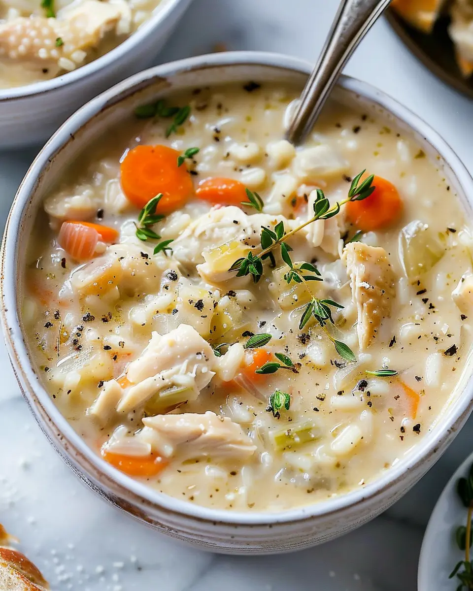 In summary, creamy chicken and rice soup is a comforting dish that blends warm flavors with wholesome ingredients, making it perfect for a cozy evening or a busy weeknight meal. The creamy texture combined with tender chicken and hearty rice creates a bowl of satisfaction that elevates any gathering or solo dinner. Plus, it’s versatile! You can customize it with veggies you love or swap in your choice of proteins, like turkey bacon or chicken ham.