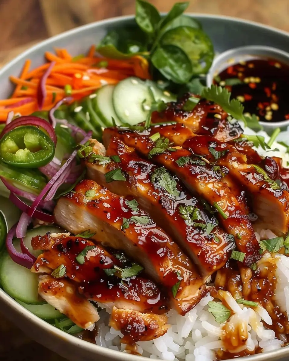 Now comes the fun part — assembling your bowls! Start with a generous scoop of your chosen grain at the bottom. Layer on slices of your perfectly cooked chicken, drizzled with the hot honey glaze, and top with your delicious veggies.