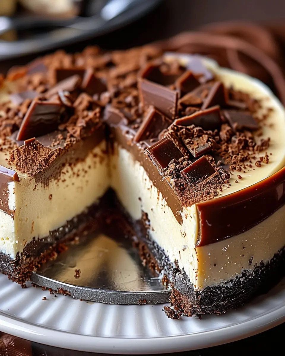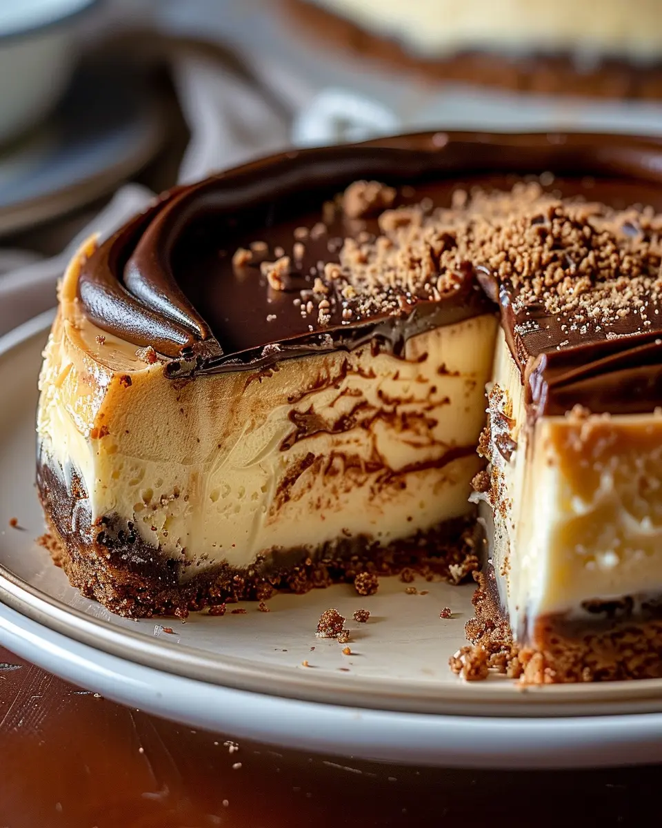 - Ingredients: Cream cheese, sugar, eggs, peanut butter, vanilla extract, and a chocolate cookie crust.