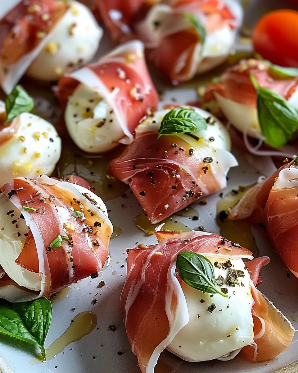 Indulge in these delicious prosciutto wrapped mozzarella bites, perfect for any gathering.
