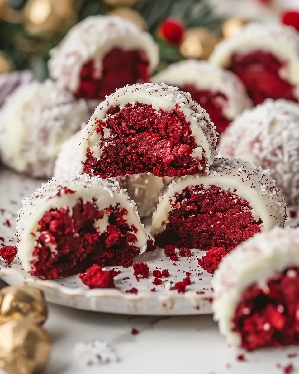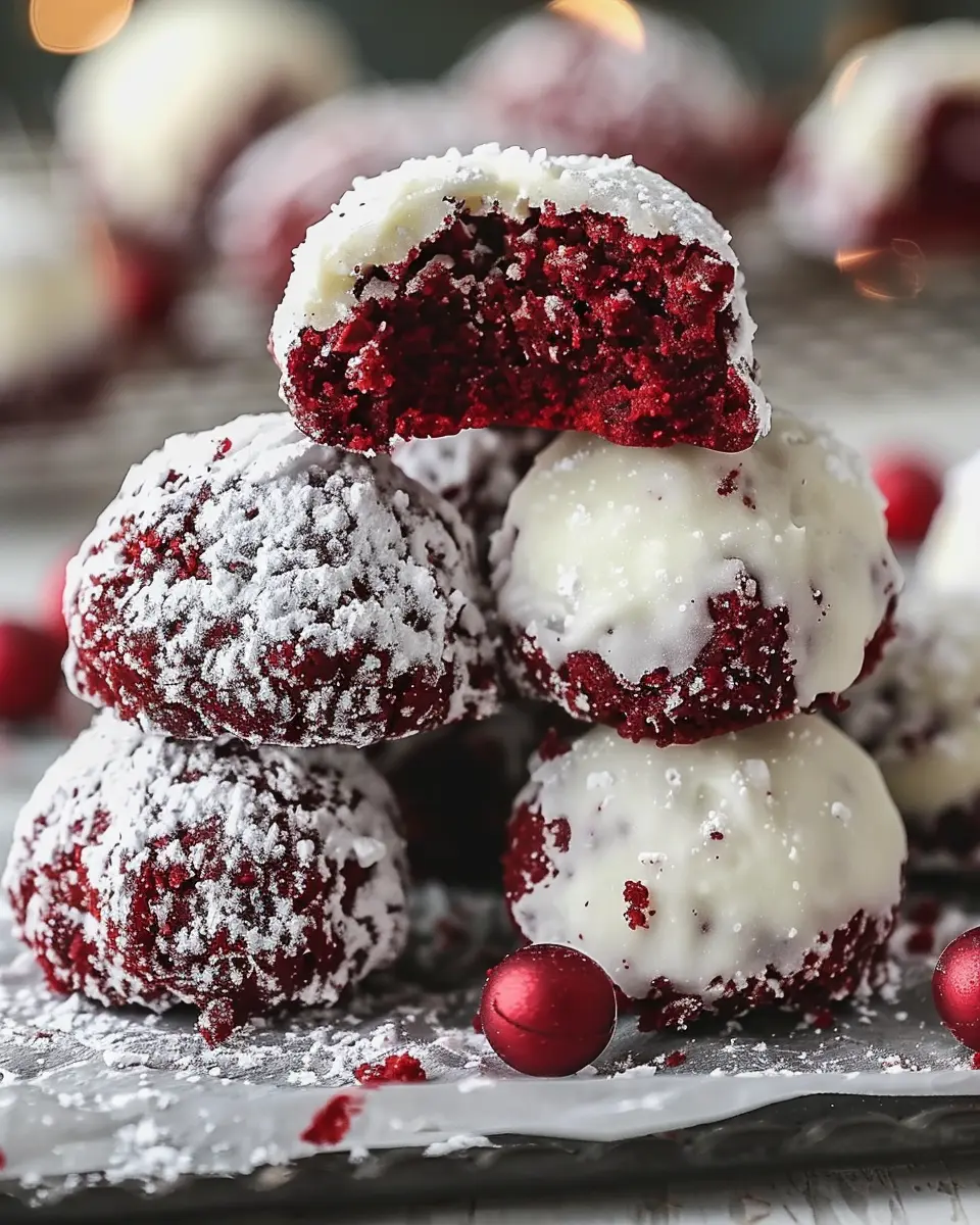In summary, red velvet snowball cookies are a delightful twist on a classic treat. With their rich, chocolatey flavor and melt-in-your-mouth texture, these cookies bring a festive spirit to any gathering. The contrasting white powdered sugar coating adds a charming visual, making them as pleasing to the eye as they are to the palate.