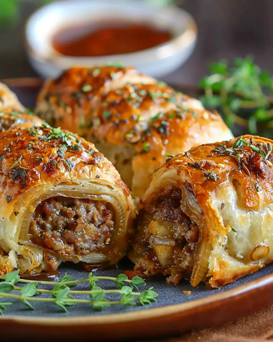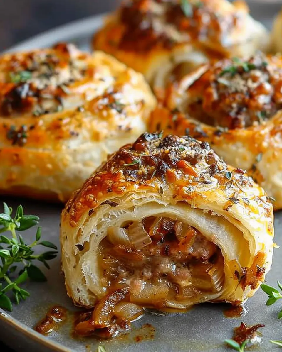 A deliciously savory twist on classic sausage rolls, melding rich French onion flavor with comforting pastry.
