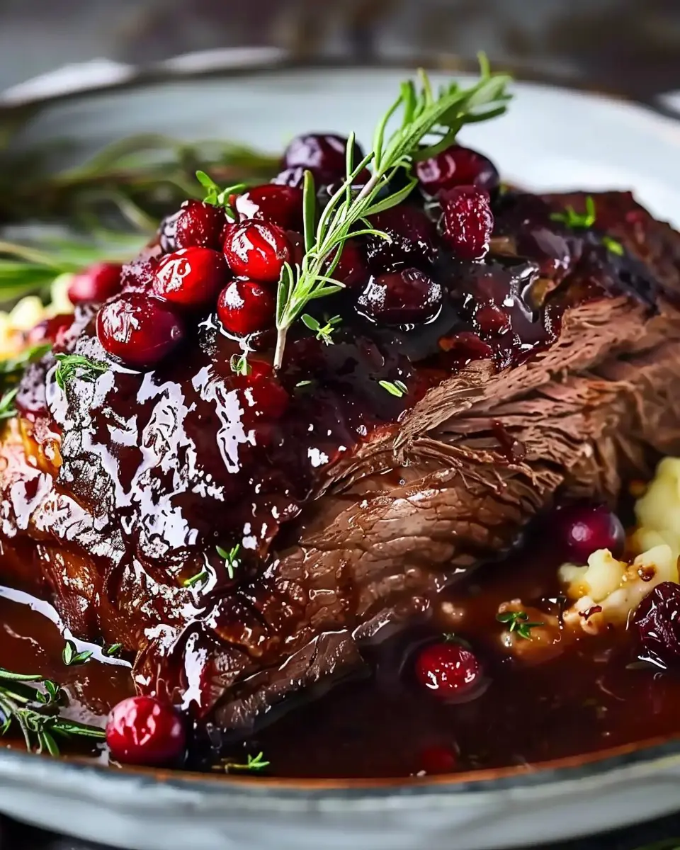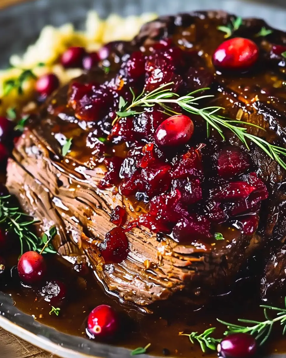 A delicious and fulfilling slow-braised beef roast recipe featuring a tangy cranberry balsamic glaze.